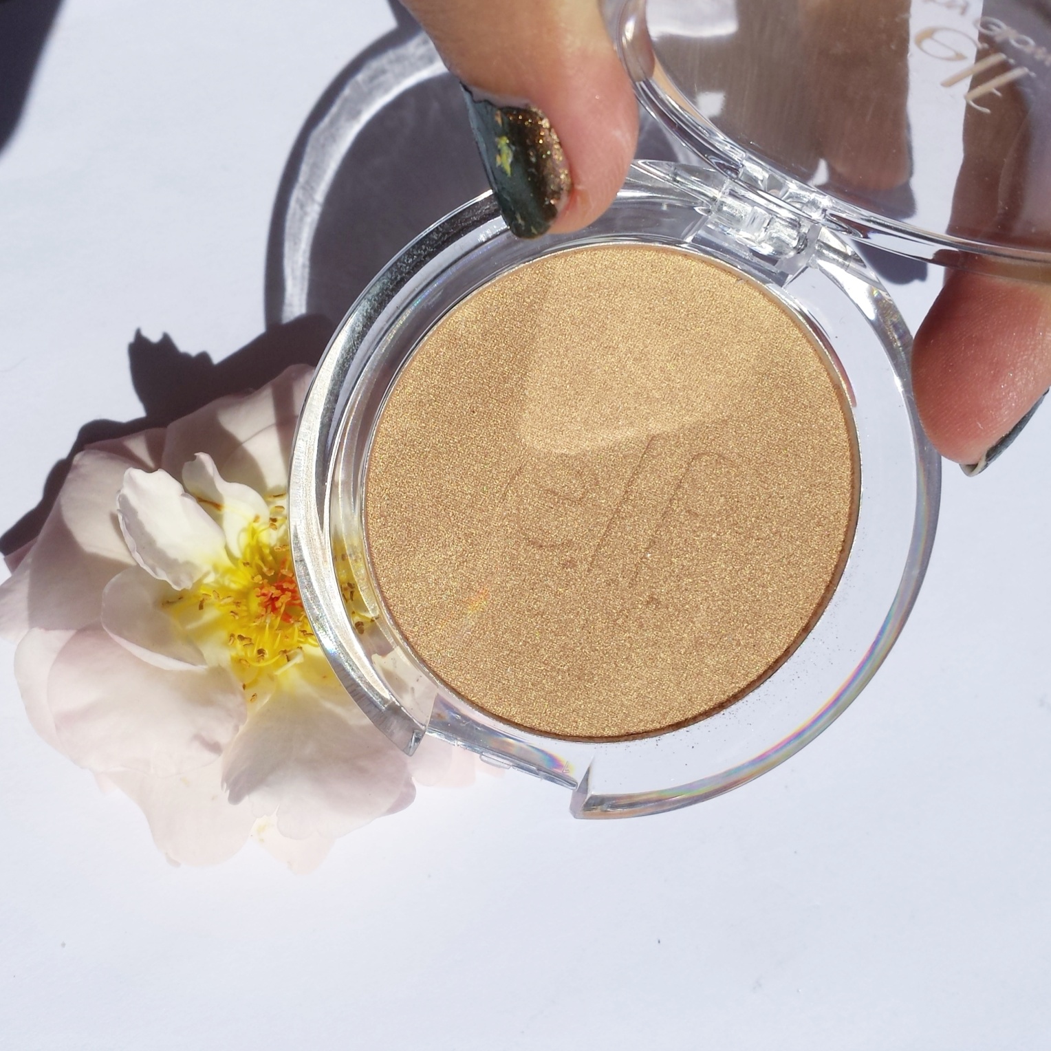 E.L.F. HEALTHY GLOW BRONZER in SUN KISSED i think is so beautiful as a highlighter.It’s an oatmeal with a gold shimmer combo color.Gorgeous.