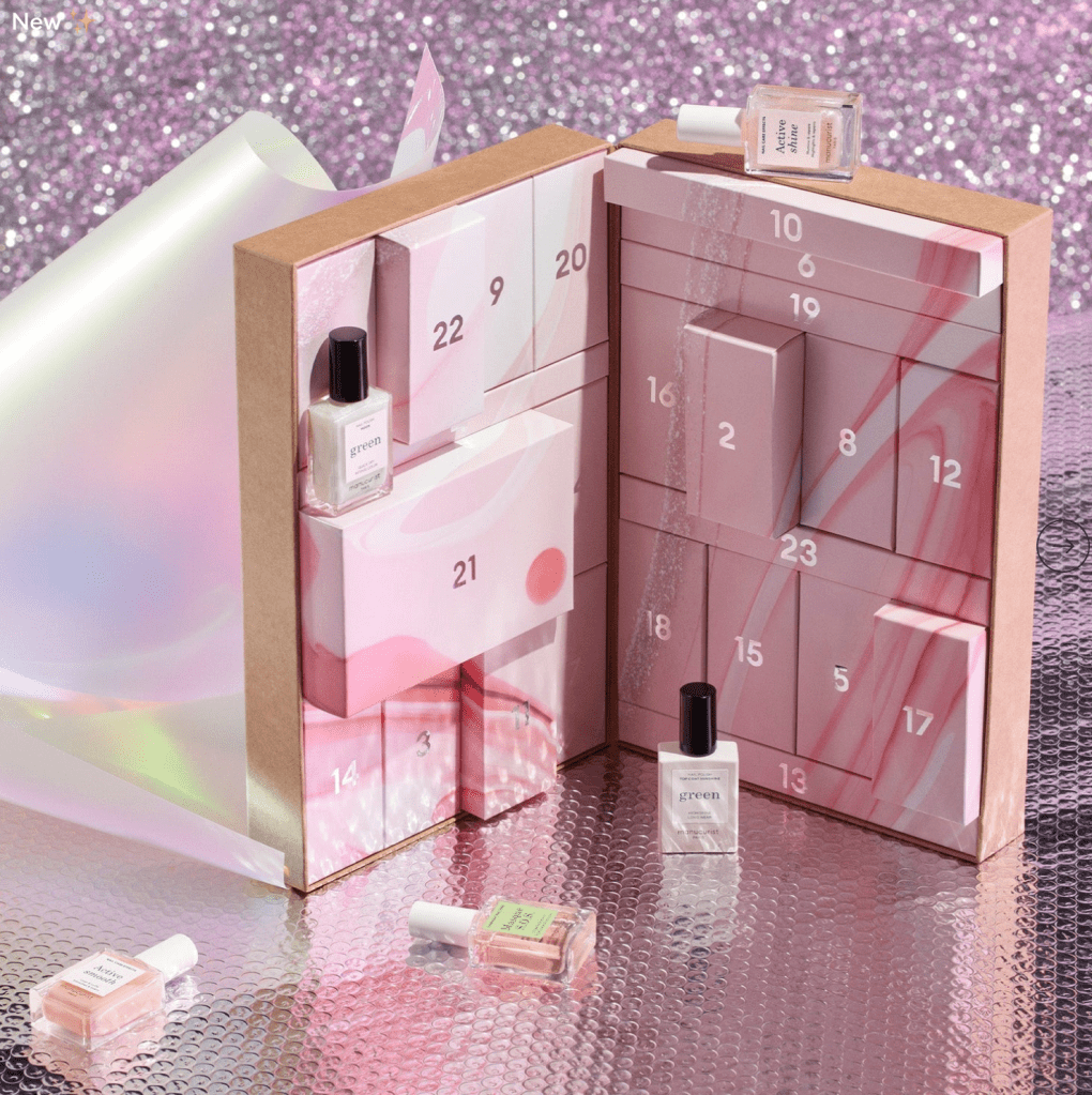 MANICURIST Advent Calendar Let it Glow! $139 Inside: AWARD WINNING INNOVATIVE Green™ nail polishes , Active™ color & care polishes, manicure essentials, nail and hand care products, and more, all between 75% and 99.8% PLANT BASED! An extra-limited edition offer to awaken the natural glow of your nails and give yourself a self-care moment. Nailmalism the new way!An amazing selection of 24 FULL-SIZE products!